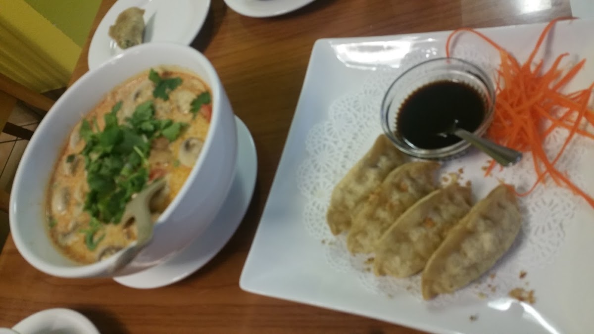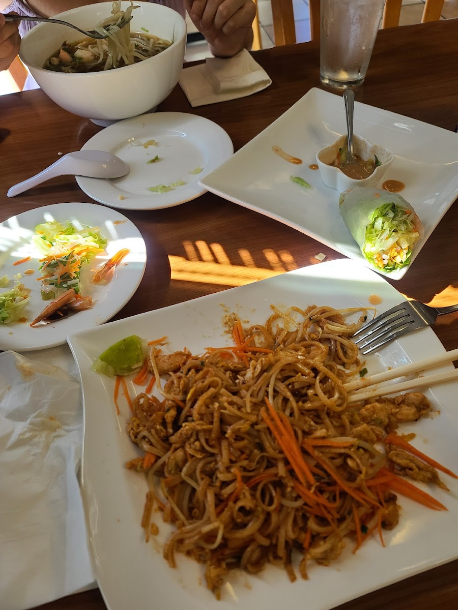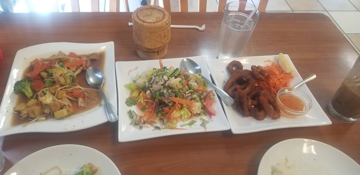 In addition to main courses, the menu includes appetizers such as fried calamari and mixed vegetable dishes like Vegetable Green Curry and Pad Pak. Traditional Thai soups and noodle dishes such as Pad Thai and Boat Noodle Beef are also available, providing a range of flavors typical of the region’s cuisine.